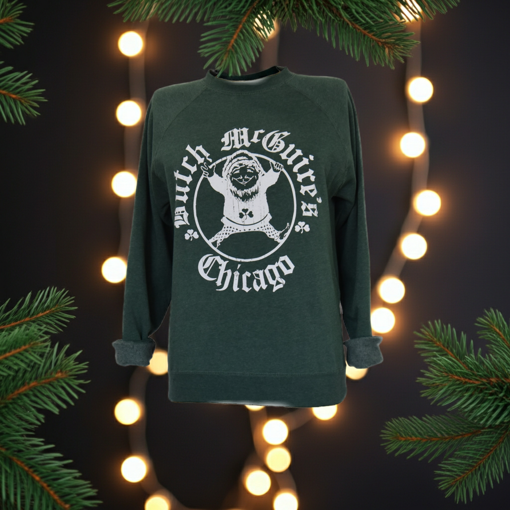 Step up your Chicago style with the Butch McGuire's College Sweatshirt, a cozy tribute to the legendary tavern! This classic sweatshirt captures the timeless spirit of Butch McGuire's, a Chicago institution since 1961, blending vintage vibes with everyday comfort. Crafted from a soft cotton blend, this forest green sweatshirt features a relaxed, collegiate-inspired design with ribbed cuffs and hem for a snug fit. The front proudly displays the original Butch McGuire's logo in crisp white, showcasing Butch in his iconic dryer-spinning pose with raised fingers—a playful nod to the tavern’s lively history. Encircling the design is the text "Butch McGuire's Chicago" in a bold, vintage font, letting you rep your Windy City pride wherever you go.